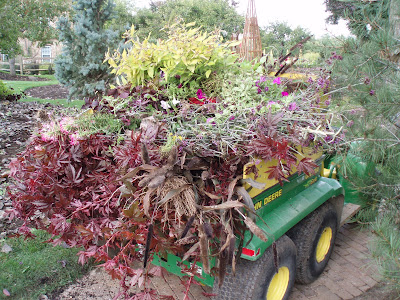Marv and Terry did a lot of path repair, regraveling and edging today. This is the type of work we normally don't have a chance to do but are trying to squeeze it in this week before our special events preparations (holiday lights show) begins. Tony pressure-washed the reception garden wall (stacked and mortared lannon stone) and it looks as good as new. Rick worked on boulder edging and cutting down some trees. Janice and Marianne did a lot of tidying today as we removed lots of annuals with the Grumpies (see below), Shirley and a new volunteer; Kathy. Jerry and Larry bounced around with various odd jobs as did Jumbo Jim. It was a very productive Monday with a full break room of 15+ volunteers this morning! Nice ornamental fall color on the native Toxicodendron radicans in the bottom photo. That's poison ivy by the way!Monday, October 6, 2008