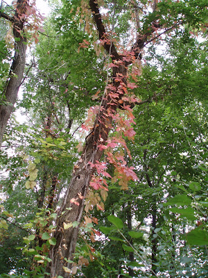 Tony worked on more pressure washing while Rick kept busy hauling and placing boulders to shore up some of our previously flooded paths. Larry did lots of projects including weed whipping in the rain. Sprinkles came down all afternoon and continue this evening. Jerry worked on winterizing one of our ponds and collecting debris. Janice had a great crew of Kay, Heidi and Barb. The ladies did some major clean-up and their productivity is something to behold! Great day despite the weather (and we could use the rain anyway). Below is another shot of Virginia creeper (just turning red) that is working up a large tree. Always garden in three dimensions and look for "vertical opportunities" with vines. Know your vine though before it's planted!!!