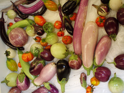 Last year we had a huge collection of hot peppers (232 varieties) that included many ornamental ones like 'Ignite' above and those that had dark purple or variegated foliage. We also grew some of the more commonly know culinary varieties like jalapeno, habanero, scotch bonnet, etc. This year our minimal collection of 25 varieties will also include 'Bhut Jolokia' (also called 'Naga Jolokia') which is said to be the hottest pepper in the world (Guinness Book of World Records). We ordered this variety (originally from India) from the Chili Pepper Institute (New Mexico State University) which is a great resource for information regarding hot peppers. Hot peppers are loosely ranked in "heat" by a measure called Scoville units. Read