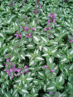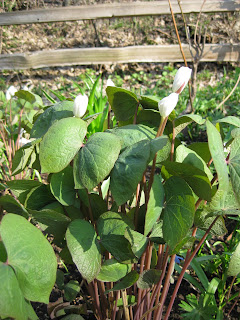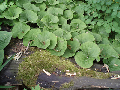 As I type this morning, the rain is really coming down and we have 8 volunteers waiting for a break in the action. We'll see if we get some clearing so we can head outside. There aren't many indoor projects as we've used most of those up on other rainy days. This is the only time of year that you can see the ground-level blossoms of the native American ginger (Asarum canadense). See below for the unfurling leaves as they emerge with silvery undersides. The blossoms are deep maroon and low to the ground and there is some debate as to weather they are self-pollinated or pollinated by insects. See bottom photo for the summer appearance of this hardy plant.