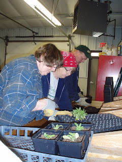 otting mix with 1/3 mushroom compost and feel this will be a nice blend for our 50+ containers out in the garden. Dr. Gredler has been out mowing and accomplishing various gardening tasks. Marianne, Janice, Bob and Kay all transplanted annual plugs (over 800) in to larger containers which was essential as these will be part of one of our new displays. I think we all respect the amount of work done in greenhouses in terms of "bumping up" these plugs in to larger containers (see to the left). With cold evenings, most of these plants need to be inside, however, on days like today, we get them out for some fresh air and sunshine. Without a hoop house or greenhouse, we do a lot of moving plants inside and out in April and May. Oh well. We know the routine. See our cart of tender plants that we drive around all day to be in part sun (so the plants don't scald as they've not seen light for a week or so in the back of a semi).