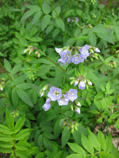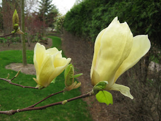 stall a refurbished fountain in the sunken garden and troubleshoot some other water feature "issues". Plenty more blooming today. Note Jacob's ladder (Polemonium caeruleum) in the gazebo garden and the gorgeous blooms of 'Yellow Lantern' magnolia (Magnolia hybrida) to the right. I've been really inspired by the magnolias this spring.Tonite we'll have a volunteer work evening and will be dividing daylilies again. This will be a smaller crowd and includes many volunteers that couldn't make it this past Saturday. Janice will come in and help me get organized and we'll probably end up with another 300-400 divisions. All the vegetables will be rolling in next week as will some miscellaneous herbs. Sara brought in our new garden signs which will be installed soon as well. These are fancy, descriptive garden area signs that have full color pictures, text and other information. Nice shot below of the flowers of a quince (Chaenomeles sp.) blooming in the gardens. This is the contorted version although you might be noticing some quince around town with extremely bright red or orange blooms. See http://en.wikipedia.org/wiki/Chaenomeles for more information about this rose family relative (native to Japan, China and Korrea). I don't notice quince unless it's blooming but when it does, enjoy it!