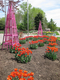 effect" (nice shot by Sue S.). Warm temperatures over the past couple of weeks have encouraged blooms a bit earlier than usual but our tulip displays should hold for the busy Mother's Day weekend (see to the left). We get hundreds of visitors if the weather is nice and it does look favorable although a bit on the cool side.Great day today with Margaret and Kay working together and taking care of some serious weeds. I was able to spray herbicide in some of our really bad areas but we're doing pretty good with weeds (until our cottonwoods seed themselves everywhere in the next month or so). Marv and Terry hung all our hanging baskets which took some time as we have to bend down their hooks so people can't walk away with them. Surprisingly enough, we've had planted containers and hanging baskets "walk away" from here. Unbelievable. Marv and Terry also planted some trees and did various tasks in preparation for our big spring weekend. Marianne did a great job on tidying, preparing the cutting display, planting hostas and also transplanting pachysandra