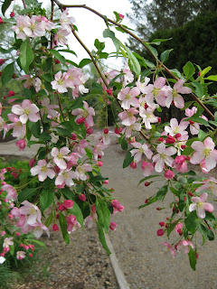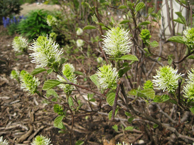 in the Japanese garden to replace those patches that we lost in the floods of '08. Dr. Gredler did a lot of mowing and we also saw Maury, Bob T. and some other volunteers. Luis O. came in and we're trying to finish up some labeling and relabeling in the sunken garden. Our GIT team (Garden Interpretation Team) has done a great job out there and we've alreay replaced over 1000 labels with many more to come. This was long overdue and the gardens look so much better for these improvements. Nice shot of 'Red Peacock' crabapple (Malus) to the right. I love the "bicolor" look of the blossoms with the darker unopened blooms augmenting the lighter pink blooms that are fully open. Very nice! Hopefully our compost sale will do well tomorrow and our plant sale the following weekend. Nice shot below of the fragrant, early blossoms of Beaver Creek fothergilla (Fothergilla gardenii 'KLMtwo'). Also called witchalder, this small shrub also has a wonderful fall color and can take some shade.