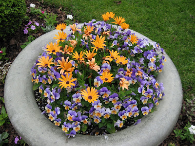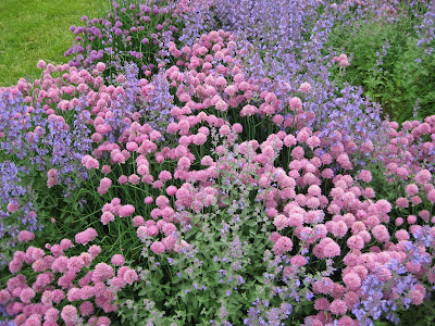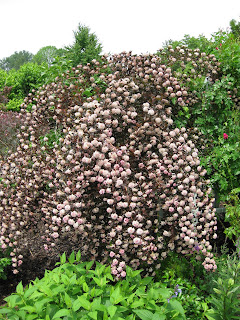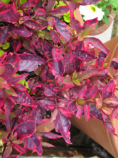 Nice shot of our English cottage containers above. Note the nice splash of white from wooly sage (Salvia argentea 'Hobbit's Foot') that has felty, "lamb's ear-like" leaves. In keeping with the pink theme around the gardens, we've used lots of nice tropicals in there including
