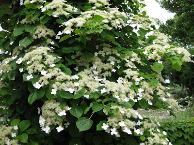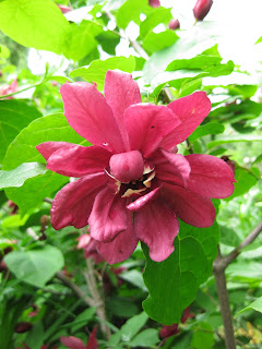 Today was hot and fairly miserable. Marianne came down early (as a volunteer) to finish weeding the front of the building (bless her heart) and we had Heidi, Luis, Magda, Sara, Mary W., Roy and Mary J. come in to help plant and weed in the heat. Everyone was soaked thru to say the least. Little Jerry mowed and worked on pruning and collecting debris. Larry weedwhipped, hauled debris and did a lot of watering. Jumbo Jim helped the 4H Cloverbud camp kids plant annuals and Dr. Yahr and Dr. Gredler were here as well. Bill came in to prune boxwood "meatballs" this afternoon and I was able to unload 9 gallons of Round-up in our worst weed-stricken areas. More of the same heat tomorrow but we'll manage. We get lots of questions this time of year about the big trees with large, heart-shaped leaves that have large white clusters of fragrant blooms. The picture below is of the Northern catalpa (Catalpa speciosa) which has beautiful, orchid-like white blooms with maroon speckles in the throat and some yellow highlights. The flowers are fluttering to the ground now but will be later replaced with long pods. Catalpa is a neat tree and we have many of the Southern catalpa (Catalpa bignoniodes) varieties including golden, variegated and speckled. I love the tropical look of a catalpa and the wood has many historical uses.