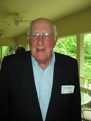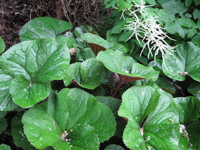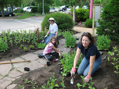 We had great planting assistance from Gina, Shirley, Cathy and Janet today. They worked with Marianne planting the last of our entrance garden. I'm amazed at the wonderful turnouts of volunteers each day to plant. This has been a very quick 4 weeks of planting although we'll be poking in annuals in smaller spots, gaps, etc. but are on track to finish by the 4th of July with freebies being utilized as needed. Marv worked on rototilling the last of our larger areas left to plant and did some fertilization of our annual beds. Terry watered, fertilized, planted, potted up pond plants and bounced around as needed. Little Jerry continued to prune near our visitors center and Jumbo Jim brought down three RECAPPERS to help tidy up the Japanese garden. Sue and Kelley weeded and planted their portion of the shade garden and Dr. Gredler worked on turf issues. Note the bold, tropical foliage below of the golden groundsel (Ligularia dentata 'Othello') that will send up golden yellow daisies in a couple weeks. I love the large foliage. The white bloom is from a neighboring goatsbeard (Aruncus dioicus). The United Way recognized their Helping Hand award-winning volunteers yesterday that included Dr. Gredler as volunteer of the year (see below) and Maury and Kay Frey for their combined efforts (see Maury with his daughter below from yesterday). All of our volunteers are wonderful and it's nice to see some of them recognized in this fashion. NO BLOG UNTIL MONDAY. I'm off for a couple of days of camping and mental recuperation (maybe).