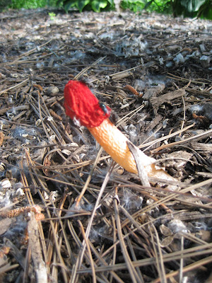 See picture above for the dog vomit slime mold. Marv found this out in the gardens and Janice (see picture below) identified it after having some fun with the setting. It looked like one of the lovely treasure we find around the gardens after a wedding reception (along with cigarette butts, beer bottles, etc.). What an interesting "thing". I've "cut and pasted" some information from Janice below describing this slime mold (source referenced). Be sure to see the bottom photo (taken here last week) of the Devil's Dipstick mushroom. Another common name is Dog Penis mushroom. More flowers in future posts but the garden also contains other curiosities as well (ours has Janice below....)