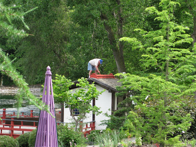 Another great Grumpy day today with a bunch of guys (Ron, Rollie, Bill, Del and Charlie) planting trees with Larry. Bob T. did his air edging while Dick P. and Dick H. placed some posts for a new access gate at the Horticulture Center. The carpenters (Dave, Jim, Bob A. and Vern) worked on repairing the arched bridge as Terry T. scraped that same bridge in preparation for painting. Maury did some "high risk" painting (see below) and we even had some planting help later from the fellas.