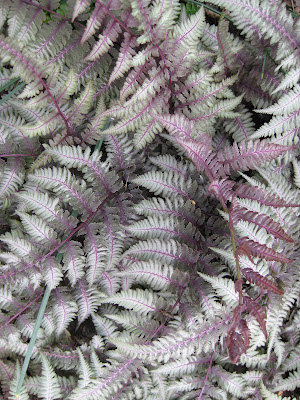 Athyrium niponicum). What a nice combination of silver and purple tones. Considering ferns don't have flowers, their interest is in texture and foliage impact. The bottom image is of false indigo (