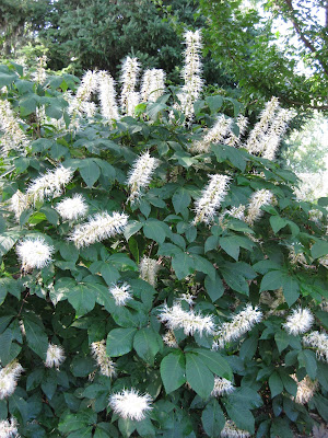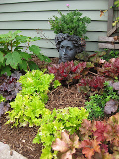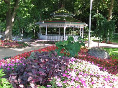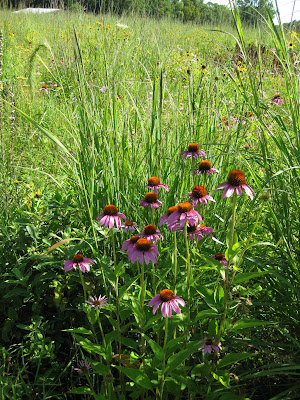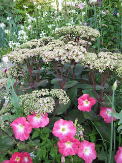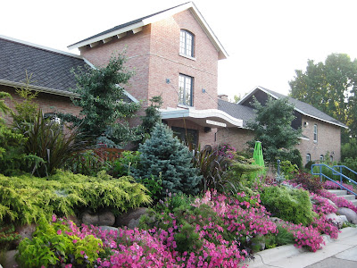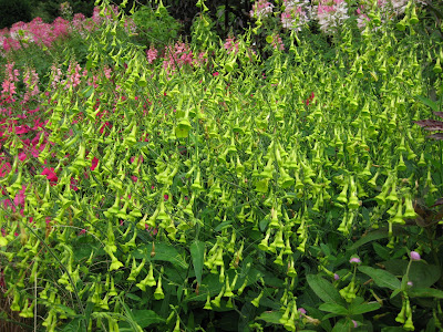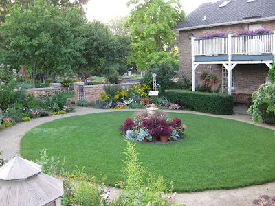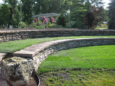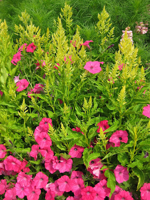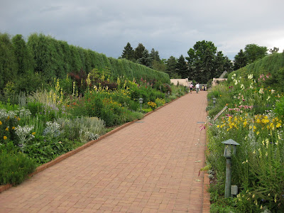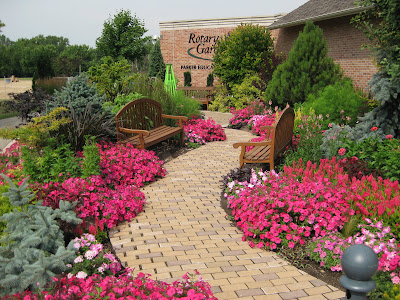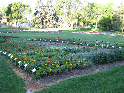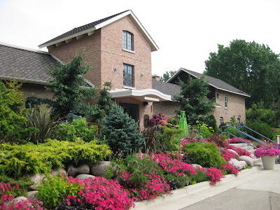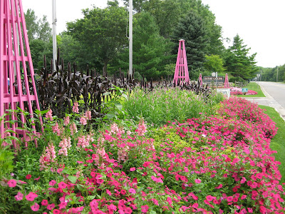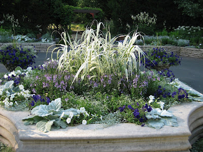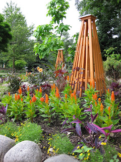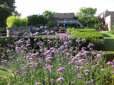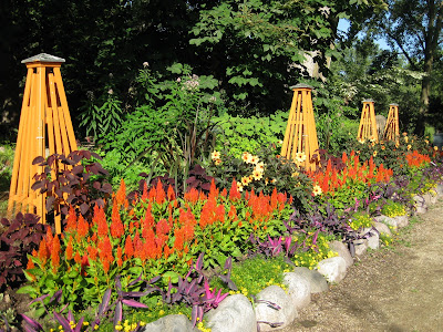 Looks like a doozy of a storm system is heading our way. We had another .5" of precipitation last night in the form of a heavy downpour. This is one of the first days we've had all summer where we didn't water anything. Tomorrow is our 17th Annual Home Garden Tour that features eight area home gardens and we've never had rain for this event. The forecast calls for scattered rain but I hope it waits until the end of the event at 4 pm. Nice shot above of our formal annual sections. Marv and Terry do an awesome job shearing our boxwood hedges (twice per year) and this garden is filling in nicely. We've had some criticism regarding the bright blue obelisks but it's safe to say that they wont go with being un-noticed! Below are some of our seasonal berms starting to peak. We had Susan from Ball Horticultural Company (West Chicago, IL) come out to visit today and she looked at much of their plant material in this very space. Nice visit.