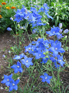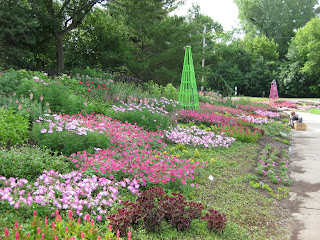 Japanese garden while Ron, Charlie and Bill finished up our new bench pad nearby. Gary and Del watered while Bob T. and Ron air-edged. Bob A. stained a new bench and we had Shirley weeding and Mary and Art planting. Our breakroom was full today and our grounds staff of Marv, Marianne, Terry, Larry and I all kept busy with various jobs, tasks and duties. Dr. Gredler was here mowing as well. We're focused on keeping the gardens irrigated over these dry days as July and August can really be tough on our thirstiest plants. Much of our efforts this time of year revolve around "artificial precipitation". We don't take the odds on rainfall and continue to target our driest areas. It is preferable to water deeply and more infrequently than to pamper plants with shallow watering (which we do here too!). The goal is to encourage plants to develop more extensive roots so they can make it thru a tough dry time. Looking forward to my vacation coming soon (road trip out West). No blogs between July 9 and July 19. The plant to the right is a delphinium variety 'Diamonds Blue' from Ball Seed. This is one of the new ones that we're trialing here this year. Our pink and chartreuse scheme is starting to fill out as seen below. Should be interesting to see it peak in a month or so......