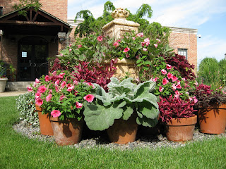 Iochroma 'Royal Queen' with huge clusters of purple/blue trumpets. This is a neat annual but is proving to be quite tall and floppy. Staking will be required shortly but that is a small concession for such neat blooms. I'll keep an eye out for perusing hummingbirds. This annual is new to me this year and seems to have some potential in the full sun garden or in containers. Today was another nice day with 80 degrees and sporadic clouds. Larry worked all day on repairing a nightmare water leak that amounted to digging a grave-sized hole to deal with this leak. Janice was here and worked with Winifred to plant some gaps in the sunken garden and east entrance. Little Jerry mowed, pruned and cleaned up around the Japanese garden. Bill is out there as I type cleaning up paths and we were fortunate to have Mary, Roy, Kay, Heidi and Donna all weeding today. They focused on purslane and were distraught to see that someone else had hoed (spelling?) up a lot of purslane and left it on the ground. Purslane will re-root and continue to grow if left there so they spent hours cleaning up the mess from another well-intentioned but ill-informed weeder. Regardless, our anti-purslane progress continues. Barb and Bev came in and weeded and planted in the Azalea/Rhododendron garden. They do nice thorough work. I'm continuing to work on lists and getting everything in order before vacation and did some watering as well. I'll do one more post tomorrow afternoon but will then sign off for 10 days. I should have some nice images from the Colorado State flower trial garden, Denver Botanic Garden and hopefully some other botanical stops along the way. Nice shot of our English cottage garden containers below. Note the wooly sage (