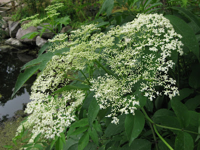 Sambucus canadensis). These flowers will eventually become those small purple berries that are used for jams, jellies and wine. As you travel the smaller highways and byways, you may note these growing in ditches and low spots. All of those 6-10' tall shrubs covered in bright white flower clusters are what you see below. There are lots of neat ornamental elderberries but those are mostly of European heritage.