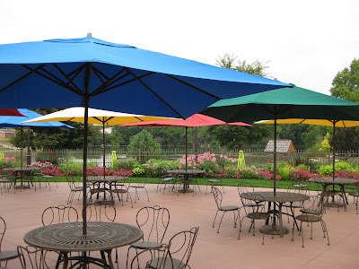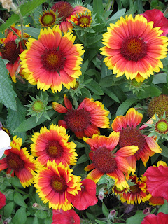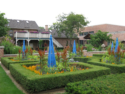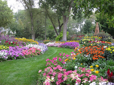 We had a productive morning before the drizzle became a minor deluge. Marv set up sprinklers, trimmed shrubs, weeded and fertilized, etc. He sure accomplishes alot of work in a short period of time. Terry also watered but got his push mowing done early, as did Janice. Janice also organized some donated plants and worked on organizing our reference library. Marianne did her normal Friday thing of tidying, weeding, preparing the cutting display, watering, fertilizing and ending with peeling old sign labels as the weather turned sour. Little Jerry and Dr. Gredler worked on mowing while Dr. Yahr worked in our new wishing well garden. Vern was here as was Maury. Kay worked her "weeding kung fu" in a neglected portion of our formal gardens and really did a nice job (as usual). See below for a view of our annual beds just east of the visitors center and the formal annual sections. We're pretty happy with how they look right now.