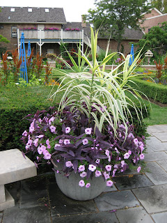 ures this morning with such good lighting and caught blanket flower (Gaillardia aristata 'Arizona Sun') to the left and one of our koi pond containers to the right. The centerpiece in that container is the variegated giant reed grass (Arundo donax 'Versicolor) with trailers that include wandering Jew (Setcreasea pallida 'Purple Heart') and petunia 'Plush Lilac Pearl'. Speaking of containers, I gave a presentation on container gardening up in Baraboo last night for the Sauk Co. Master Gardeners and some of the local public. What a great, enthusiastic group. Lots of fun and ideas. Below is a shot of our terrace garden with a distant, curved border with the same chartreuse and pink theme that is in front of the building.