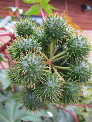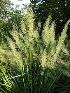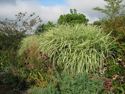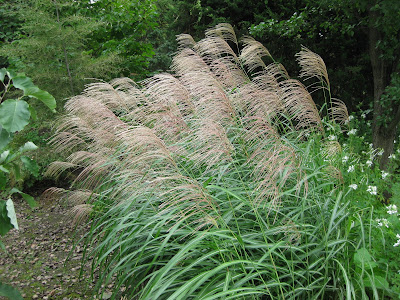 We had some drizzle this morning but have been able to work thru most of the day. Terry and Marv helped Dr. Yahr with some work near the wishing well garden and have shifted to garden clean-up in advance of some weddings this afternoon and tomorrow. Marianne helped put away plant sale "stuff" and had been able to spend a good portion of the day in front of the building in the garden area that she has maintained nicely since May. Janice pushmowed and worked on various tidying projects. Kay came in and helped Marianne inside while it drizzled then went out later to tidy up our flower beds east of the building. Her tidying skills are matched by very few. Dr. Gredler and Dr. Yahr were here as well and Kristine is coming later to hopefully do some wedding before the rain falls. Directly below are the seed capsules of another castor bean (Ricinus communis) called 'Zanzibariensis'. This monster normally gets 12-15' tall but was stunted this year with the lack of heat. A previous blog showed the pink capsules of 'Carmencita Pink'. The capsules below, while green, will turn brown in October, split, and drop seeds. We sometimes get castor beans coming up in the gardens for those seeds that make it thru winter. We prefer to collect the seeds (remember, very poisonous) and put them in the crisper drawer of the fridge. The next picture downs shows the ongoing construction of a shoreline bed in the wishing well garden (almost complete) that will offer lots of color along the West edge of that space. The bottom photo shows the arched bridge in the distance with variegated maiden grass in the foreground (Miscanthus sinensis 'Dixieland').