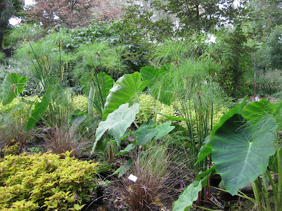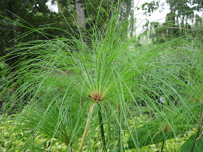 Dr. Yahr and Dr. Gredler were both here helping out today as was Bill with his superior tidying abilities. Little Jerry mowed and worked on pruning and clean-up around the gardens. Janice helped facilitate our many volunteers this morning and push-mowed, planted, tidied, watered, etc. Larry finished work on his spigot, push-mowed and has helped with projects as they came up today. Rod and I did a nice presentation for the Edgerton Rotary Club and hope they will consider personal membership and perhaps some type of sponsorship as a group. We'll see. The bottom images feature our giant papyrus (Cyperus papyrus 'King Tut') that is around 8' tall right now. Note the interesting "appendage" of thread-like stems at the top. This monocot is a member of the sedge family and while not hardy, it sure grows well in our summers. The bottom photo shows this plant with elephant ears (Colocasia esculenta) and other goodies.