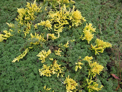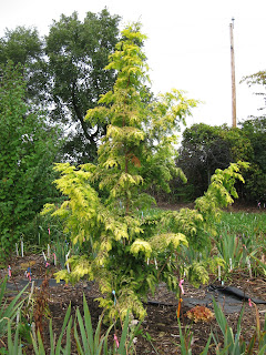 earing another area. These young adults (and their instructor, Leslie) were very helpful and had a good day at the gardens accomplishing various tasks such as plant removal, planting, bulb sorting and clean-up. Marv, Terry and Bill worked on composting the new shoreline border in the wishing well garden and all three moved on to other tasks around the gardens. Marianne tidied up the entrance garden, ornamental edible wall, watered, etc while Little Jerry worked on various pruning projects. Larry worked on water features, cutting bricks and helping out as needed. It was Dr. Gredler's 85th birthday today so we celebrated by making him take us all out to lunch. I love the golden black locust (Robinia pseudoacacia 'Frisia') to the right. It offers some tangible "brightness" in the fern and moss garden and really catches the eye in a garden that is primarily green. Lots coming up including Shelley Ryan from The Wisconsin Gardener (WPT) show here tomorrow to film some segments. Looming weather looks damp so we'll see what we can accomplish! "Death Row" below with elephant ears (Colocasia esculenta) and begonias enjoying their last days before frost (although we do save the elephant ear bulbs over winter).