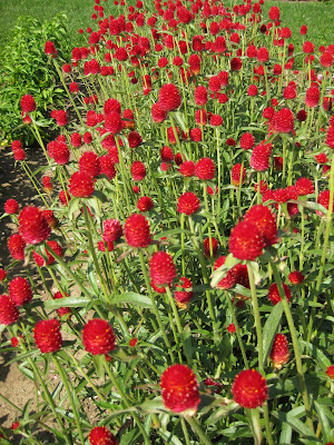 The plant sale continues today thru Sunday (possible clearance days beyond that) and while lightly attended, did bring in some nice sales. We hope to have increased traffic and a super weekend if the weather is nice. Today, though, was business as usual with Marv and Terry working on all sorts of projects, including watering and Marianne and I hanging out by the plant sale. Marianne was able to work out in the gardens for a bit but kept close to the plant sale as needed. Larry kept irrigation moving along and checked water features as usual. Dr. Gredler mowed and worked on some turf repair while the Grumpies went right down my list of things to do. John and Dick P. hauled some wagons back that were lent to us for the plant sale. Ed, Ron and Bill cleaned up the east parking lot and helped with mulching after break. Maury ran lots of errands. Del and Gene watered then moved on to help others while Rollie, Dick H. and others worked on composting our veggie collection (essentially the open areas vacated by our tomatoes). Mary helped with weeding and Kay was here to help Dr. Yahr do more planting. It was a busy crew augmented by plant sale volunteers and a very productive day with perfect weather. The image below is of 'Fireworks' globe amaranth (Gomphrena) that is new this year. It has a distinctive shape as opposed to other gomphrenas that are tightly rounded. Note the "sprays" coming off the flowers. I didn't think this was too interesting until I saw it en masse (next picture down). Next year, our annual collection will include lots of gomphrenas, including this one. However, my favorite continues to be 'Strawberry Fields' at the bottom!