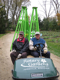 this month. Janice cleared out containers, collected debris and worked with our high school volunteers this afternoon. Little Jerry was out pruning and Bill spent the day collecting leaves and other debris. Larry helped flush out the irrigation system and water lines, planted shrubs and ran electric cords for the upcoming Halloween Walk. Dr. Gredler was here mowing and we saw Dr. Yahr, Maury, Dick, Joanne, Carrie and Gary for various reasons as well. The frosted annuals continue to be removed and we're about 50% done with that activity. We're also starting to haul in our obelisks from select areas (as seen in the picture of Urban and Ron). We'll decide on their 2010 paint color shortly.....The Halloween Walk starts this Thursday and we'll segway in to Holiday Lights Show preparations next week. We hope to have a good work day on Saturday and should have all of our fall planting completed by then (if we get thru our bags o' bulbs below... and these are just the daffodils...not the 3,000 tulips).
