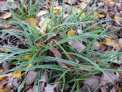 nd collect/shred leaves. Jumbo Jim brought three RECAPPERS down and they did a great job collecting leaves and perennial debris from the Japanese garden (nice shot to the right of that garden today). Kay spent a productive four hours in the color rooms collecting debris and cutting back perennials. She brought back some pretty impressive loads.To the above left is a shot of the saffron crocus (Crocus sativus) in bloom today. Saffron has been used as a seasoning/herb for over 3,000 years although it takes about 75,000 of these blooms to create 1 lb. of saffron (worth about $1,000). That means our three saffron crocuses can produce about 4 cents of saffron each year (fundraiser?). Again, this is a marginal bulb for us but to see blooms around Halloween is pretty neat. Foilage also becomes so important this time of year (aside from fall color). Note the sedge (Carex morrowii 'Ice Dance') below that will have foliage interest well in to winter. Always plant "clumping" sedges and be wary of those that spread quickly. 'Ice Dance' is a slow spreader and will create a manageable colony.