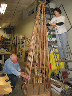 on was too damp. Dr. Gredler was out collecting leaves as Little Jerry and I did a "drive-thru" of the gardens to scope out his next pruning projects. We all ran for cover eventually. See below to the left for Janice and Dr. Gredler decorating an obelisk. Not the flat cart at the base which allows Doc to spin the obelisk as Janice applies the lights. Works well but can contribute to some motion sickness issues! Terry can be seen to the right engaged in the tedious activity of l