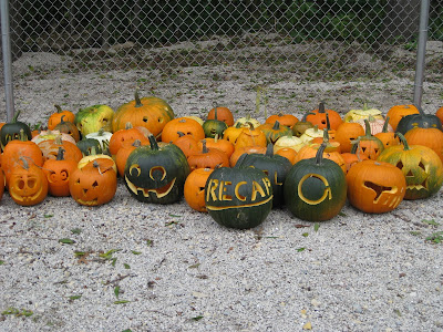 age and helped with some event preparation. Both Janice and Marianne helped with lights for the Halloween Walk, organized bulbs, yanked plants, tidied and also had time to plant the last of our perennials (almost). Dr. Gredler was here to mow and Little Jerry worked on planting shrubs in the Japanese garden and pruning. Kay removed annuals in the sunken garden and Jumbo Jim brought down four RECAPPERS to help tidy up the Japanese garden. We also saw Maggie, Maury, Dr. Yahr and Jenny came in to work on making close to 800 new labels for our donated daylilies.We hope the rain doesn't affect the Halloween Walk (see our Jack O' Lanterns below) and we'll finish the last of our preparations tomorrow. Nice shot (above right) taken today of the azure monkshood (Aconitum carmichaelii 'Baker's Variety'). This perennial has taken five frosts now and hasn't blinked an eye. You can see how it gets the name monkshood! The bottom image of our arched bridge was taken today and that new coat of paint really made a difference. Hard to believe this bridge was 1/2 under water last spring.