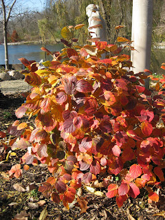 The fallen leaf above is from a sweetgum (Liquidambar styraciflua) near our arboretum. This plant will struggle further north and we're lucky to have such a nice specimen. Nice shot below to the left of the fall color of the Beaver Creek fothergilla (Fothergilla gardenii 'KLMtwo'). The weather was perfect and quite
