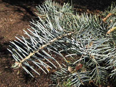 Janice and Marianne have been very steady and committed with lights work as our timeframe is tight. Dr. Gredler worked on mowing and other tasks and we also saw Jean and Rose. Larry pumped out the sunken garden pond and will be helping put up displays later in the week. Little Jerry worked on cutting back shrubs and light pruning on trees. He brought back plenty of debris. I ran cords and started laying out various areas for displays and lights. Note the fall color and form of this upright beech (Fagus sylvatica 'Fastigiata') in our arboretum. Narrow trees create focal points, make statements and may be warranted in those narrower garden spaces or locations where that form can be accomodated and featured. There are upright versions of many trees and shrubs. Note some foliage interest below (from today). In order, we have the fall color of the American smoketree (Cotinus obovatus), the yellow brown fall color of an 'Elizabeth' magnolia and the beautiful needles of the white fir (Abies concolor 'Candicans').