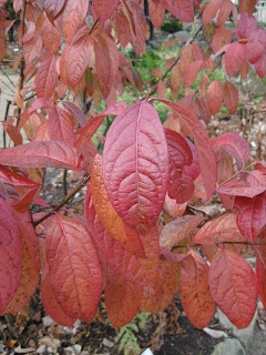 Viburnum nudum 'Winterthur'). It's nice to see this beacon of red after most other red fall color woodies have already dropped their leaves.