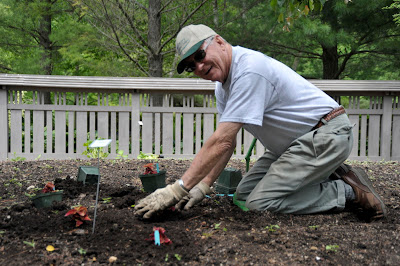 Tomorrow, Dr. Robert Yahr will receive the Lifetime Achievement Award from Forward Janesville. This is certainly an honor and while I know he's nervous about his acceptance speech, I'm sure he wont pass up the opportunity to stress the importance of supporting RBG to a VIP audience. It truly is amazing how the gardens have developed in 21 years from the initial ideas of Dr. Yahr. He remains a driving force and lends so much momentum to keeping the gardens looking good and progressively developing. Of course his lifetime achievements included U.S. Naval service and improving countless smiles as a dentist and orthodontist. Kudos to the founder of Rotary Botanical Gardens. Below is a nice photo from Tim of Dr. Yahr in action last year.Another small but productive crowd over here today. Dr. Gredler continued with his obelisk painting and is probably tired of red paint. The good news (or bad news for him) is that I have five more "conversion colors" selected for other obelisks. Little Jerry came in to work on some indoor lights show work while Dick W. was here this afternoon helping cut reindeer antlers for Del's cutouts. Vern was here working on designing a neat new arbor sitting area that we'll install this year near the