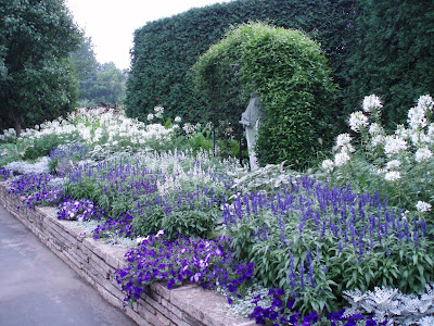 www.parkerpen.com/en/discovery/making_of/timeline. This garden is very formal in arrangement and above you see all the precast pieces that were used to create the center planter while the stacks of lannon stone became the surrounding walls with caps. The current ground surface of this garden is asphalt which gets darn hot in summer. At some point we'll go to another surface I imagine. Other neat features of this garden include the druid sculpture (seen in past posts and in the picture below) and the color theme; always blue, white and silver. See some "after" shots below...