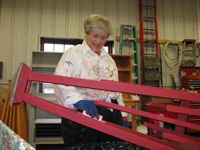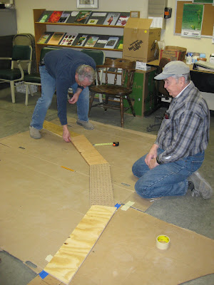 As you can see below, some of our Grumpies (Vern and Dave) are never too old to play with blocks. They are actually figuring out a complicated arch that will have to be replicated three times to be part of a large, sitting arbor that will be constructed this spring. These guys (including Dave, Bob A., Del, Big John, etc.) are very talented with carpentry and RBG is truly fortunate to have them as volunteers. The guys didn't appreciate my comment that I didn't think the wood they had laid out below (particularly the pegboard) would be very supportive or sturdy...