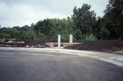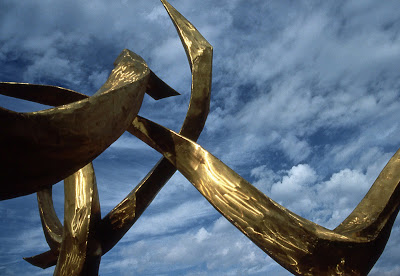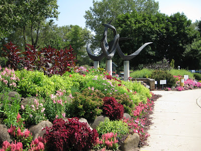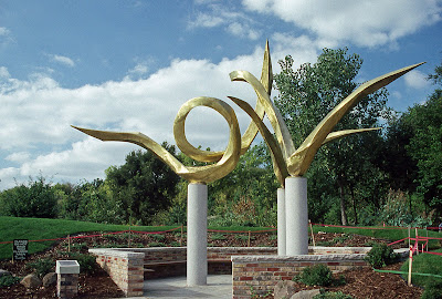 Another great turnout despite the intermittent drizzle and rain thru most of the morning. Marv and Terry went out to bring back displays while Jerry and Urban were out pruning and collecting debris. Larry was out for a bit too but everyone came in once it really started coming down. I'm not saying I prefer snow but the "warm" rains are really getting things sprouting early which is always a concern. Marianne worked most of the day on her fern labels while Janice was here working on memorial tree signs and her biodegradable pot display (which is turning out to be really cool). Bill came in later to go out on ornamental grass cutting duty and will get much of it done before we get more cold weather. Dave, Jim, Bob and Vern continued on their arch work and we saw Dave J., Richard, Big John and Polly over here today too. Aside from enjoying iris photos today, I've finished more plant orders and am working on getting ready for various spring projects. We hope to renovate the sitting area around our 'Dialogue' sculpture area and I've included a photo-progression below of the history of that popular art piece at RBG. Designed, created and installed by O.V. ("Verne") Shaffer from Beloit, the full name of this piece is 'Dialogue, World Peace Thru Friendship". Standing over 20' tall and weighing one ton, this is one of the largest sculptures in Janesville. Mr. Shaffer's work (1,200+ pieces) can be seen around the country and we're lucky to have two pieces (the other one being 'Biota' on the southeast end of the gardens). 'Dialogue' was dedicated to international peace and friendship and continues to be a focal point at the gardens. Note the original shine and the inevitable patina over the years. A 1950 graduate of Beloit College, Mr. Shaffer continues to productive with his art and if you "search" the Beloit College website with 'O.V. Shaffer', you'll see some neat info regarding this man. I tried to "cut and paste" the link but it didn't work. Regardless, 'Dialogue' continues to be an important part of the gardens and we'll look forward to renovating the wall and beds around this important piece of art.
