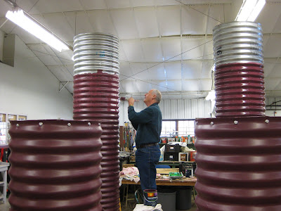 The carpenters above (Bob A., Jim and Dave from left to right) are really hitting stride with their arches. Vern helped Jim start cutting away and once they get these done, there is still quite a bit of planning left to figure out the remainder of this project. I have the utmost confidence in these guys as they have never shied away from a challenge. The warm weather brought lots of volunteers out today. Marianne helped with many projects including getting presentation handouts prepared and Janice was here for a meeting, working with her kids group and more plant sale preparations. Marv and Terry brought in more displays and Jerry and Urban did some pruning. Dr. Gredler, Maury (see below) and Del all did priming and/or painting in the "culvert forest" and we had help from Dick H. and Dick W. We also saw Jumbo Jim, Julie, Bob T. and Shirley over here today. I think the warmer weather and sunshine has had a nice effect on morale around here. I finished our spring plant sale order and worked on myriad small projects that have piled up on my desk. It will be interesting to see how much snow melts down this weekend with highs in the 40s.