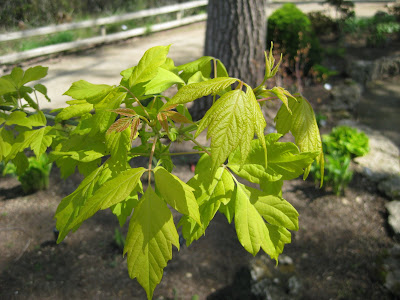 Dicentra spectabilis 'Goldheart') foliage (do you like the pink with gold?). Further below, note the vivid, emerging foliage of golden boxelder (