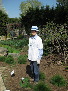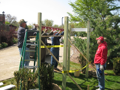 as a lovely day with plenty of active volunteers, grounds staff and vivid colors out in the gardens. It was nice having Jan (to the left) back in action in the Scottish garden and we talked about some weed control tactics in this popular garden. Jan has done a wonderful job in the garden for well over 12 years and we're fortunate to have her helping out. Mary D. was here to help weed and Janice's volunteer group came and helped weed today as well. Little Jerry kept busy with pruning and clean-up while Larry was again involved with many projects including bringing back our terrace furniture, picking up supplies and running the last of our daisy art pieces to be seal coated. Janice kept busy with weeding and we had Bill in the afternoon composting and spreading soil. Doug and Gary hauled mulch out to the main parking lot and we had Bill, Jim (new Grumpy), Del and Ron spreading mulch near our east entrance. Bob C. and Roger did a nice job composting and Big John, Dick P. and Dick H. worked on the 'Dialogue' area after helping with the furniture moving. Rollie helped haul furniture and ran the endloader to keep up with our material hauling priorities today. Dr. Gredler mulched and mowed and the the carpenter quartet (Vern, Jim D., Bob A. and Dave) continued to put up the new arbor (see below). We also saw Mark M., Geesje, Bill O., Richard and John P. today. It was truly crazy but it was a good rhythm and much was accomplished. The Ice Age Trail Alliance was here today for their conference and will be around until Sunday. What a great organization for an important state resource and amenity.