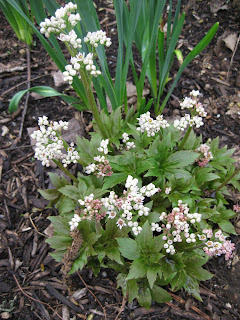 Pulmonaria sp.) are starting to bloom and their ornamental foliage is emerging nicely (see below). I love lungworts for many reasons including their mature look out in the garden as they fully foliate (see further down). I select them for leaf size and degree of "silvering". Their flowers are neat but all too fleeting.