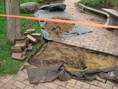 Ulmus hybrida 'Morton') out in the arboretum. Marianne worked on her cutting display, irises and labels inside. Jenny worked on more labels and we're in good shape to match pre-made labels with incoming plants over the next couple of months. When our laser engraver becomes active, we'll start on our woody plants first. Little Jerry was here briefly for our meeting and was out in the gardens showing Jumbo Jim and the RECAPPERS some work out in the gardens. Marv and Terry set out more obelisks and worked on leveling a brick path that had buckled up due to root growth from an adjacent elm tree (see photo below). They did a nice job and helped avert future tripping accidents in that space.