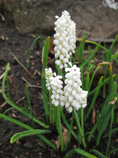 t the tropical bulbs potted up yesterday and it looks promising for more outside work later in the week. I went out and put out flags for more obelisk placement on Friday and took some pictures of more emerging plants. To the left is the white grape hyacinth (