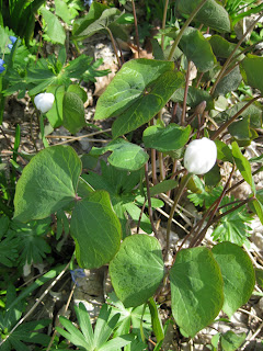We also saw Maury, Urban and Dick P. here as well. Lots of plants continue to emerge and bloom out in the gardens. To the left are the leaves of bloodroot (Sanguinaria canadensis). This native perennial has neat leaves and the white flowers (blooming now) are quite showy, particularly for the double-flowering variety 'Multiplex'. Ants distribute the seeds of this plant and the red dye from the roots was mixed with animal fat and used by Native Americans as war paint. The plant to the right is twinleaf (Jeffersonia diphylla) starting to bloom. The root of this plant, named after Thomas Jefferson, had many herbal uses but note the interesting "double leaflet" look of the foliage.The continued emergence of new spring foliage is quite refreshing. Note the tuber oat grass to the left (Arrhenath