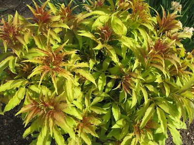 Many of our most vivid colors out in the gardens are contributed by fresh foliage right now. Below is the start of the 'Sutherland Gold' elderberry (