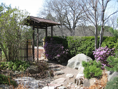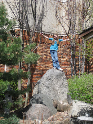 http://www.iceagetrail.org/) and this trail also passes through our hometown of Janesville, WI. Lots of neat things emerging although that area looked to be 4-5 weeks behind us as plants were just breaking ground up there. My daughter is truly a nature girl and as seen below, was easily distracted by acorns, moss, etc. She even waded out in some of the small lakes looking for frogs although the water was ice cold. I hope the day never comes where she doesn't want to explore and get a little dirty! We stayed overnight in a hotel in Rice Lake which is a nice little town. My talks for the Barron County Master Gardeners went well and the crowd of 150 or so was an enthusiastic bunch. I knew I was in Northern WI when a lady was mentioning that the Irish Spring soap she put out to deter deer from nibbling on her tree just caused the local bear to get mad and knock down the tree! The event was at the conference center of Wisconsin Indianhead Technical College which is adjacent to the UW-Barron County campus. I had read of a small Japanese garden on the UWBC campus and we tracked it down during the lunch hour. It was small but quite well done (see pictures at the bottom). Only after my daughter's rock climbing (bottom picture) did we notice the sign reading, "Parents, please keep care of your children in this garden. No climbing on the rocks." She sure thought that was funny.