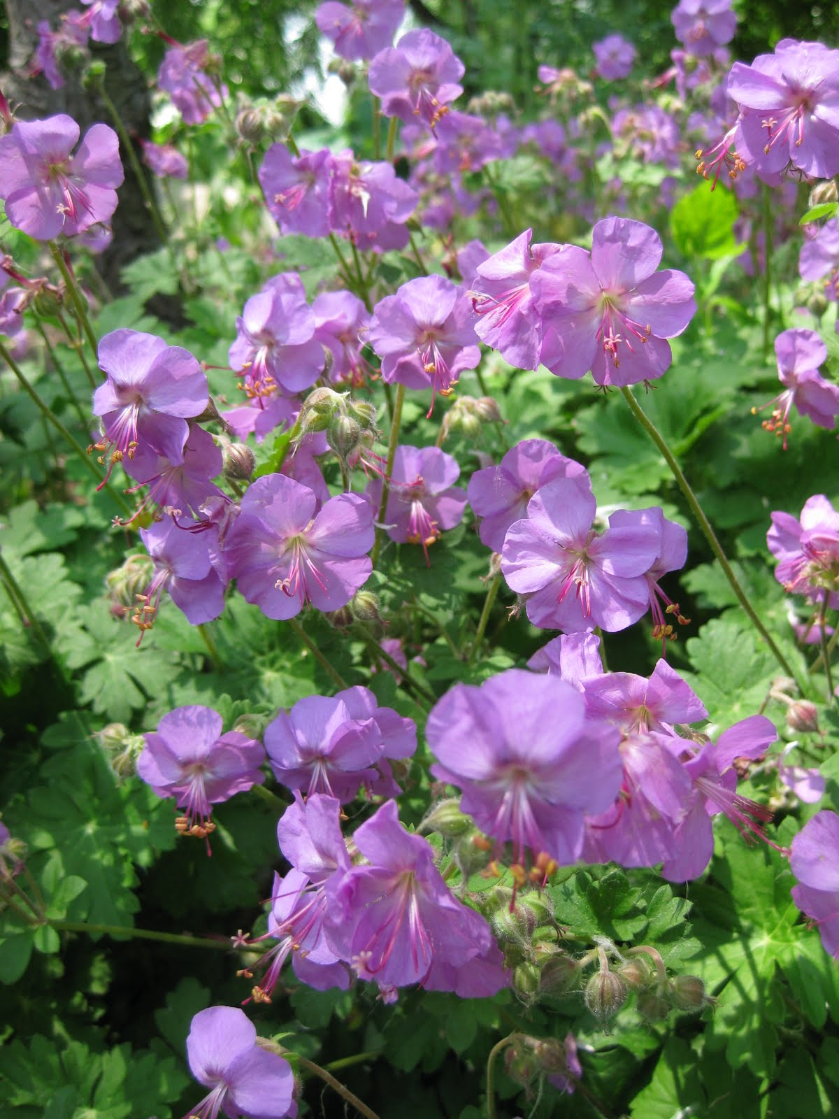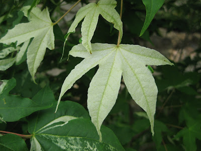 e garden and Big John planted culvert planters, removed roses, planted roses, planted containers and did other odds and ends. Aside from bed preparations, Marv and Terry also removed a tree and some shrubs, hauled cocoa bean hulls (mulch) to the rose garden and planted a nice tree. I was able to lay out lots of plants and am getting ready for planting projects both tomorrow morning and afternoon. Nice shot to the left of a hybrid bluestar (Amsonia hybrida 'Blue Ice') in the woodland walk garden that is showing some nice, light blue flower clusters and in that same garden (to the right) is one of the tough and beautiful perennial geraniums (Geranium x cantabrigiense 'Karmina') with a profusion of pink blooms. We like to mass plant geraniums like this to form a beautiful (and durable) groundcover. Below are some leaves of the variegated Shantung maple (Acer truncatum 'Akikaze Nishiki') in our Japanese garden. Some leaves are totally green, most are variegated and on occasion, you'll see neat white ones like this. Nice shot of the pagoda in the Japanese garden at the bottom too...
