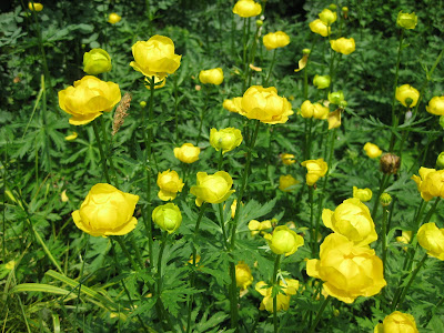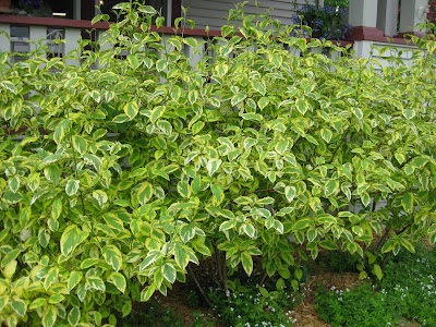 Blogging late again as it was a long day and we ran over to the Southern WI AirFest tonight. It was really neat although ear plugs would have been a good idea! Nice shot above of globeflower (Trollius europaeus) in the Scottish garden. Normally a June bloomer, we've enjoyed it for three weeks now! Crazy day but RBG is thankfully blessed with a dynamite grounds crew and Marv, Terry, Little Jerry, Marianne and Janice did a great job with their various projects today. John, Jenny and Larry round out the crew but don't work on Fridays. We had Kay today clearing bulb foliage in the sunken garden and also had volunteer assistance from Vern, Dr. Yahr, Dr. Gredler, Rose and Urban. Marv and Terry watered, prepped the reception garden for planting (no small feat), fertilized and prepped the formal perennial garden too. Everyone burned some major calories today. Marianne cut bulb foliage, did her cutting display, watered, tidied and got he compost sale ready to go for tomorrow (our last official sale date for compost (9 am - noon). Marianne also hauled about 60 flats of flowers out for me in anticipation of our planting day tomorrow. Janice planted, watered, weeded and will be helping facilitate the work day tomorrow. Little Jerry pruned and mowed and I layed out flowers for tomorrow and will again attempt to stay ahead of our motivated. The image below is a foliage close-up of a nice variegated, redtwig dogwood (Cornus sericea 'Hedgerows Gold') which is currently my favorite variegated variety. The next picture down shows a "pseudo hedge" of three of these in a row at my in-laws house. I like the look and the winter stem color is a nice, deep, maroon red. The bottom is one of my favorite foliage perennials. The golden spiderwort (Tradescantia x andersoniana 'Sweet Kate') is eye-catching and despite looking a bit flattened by irrigation, this plant will get some blue flowers soon. Spiderworts in general can reseed and become a nuisance and I have seen this variety seed out many green reversions. Oh well, cull them out and enjoy the gold appeal!