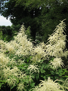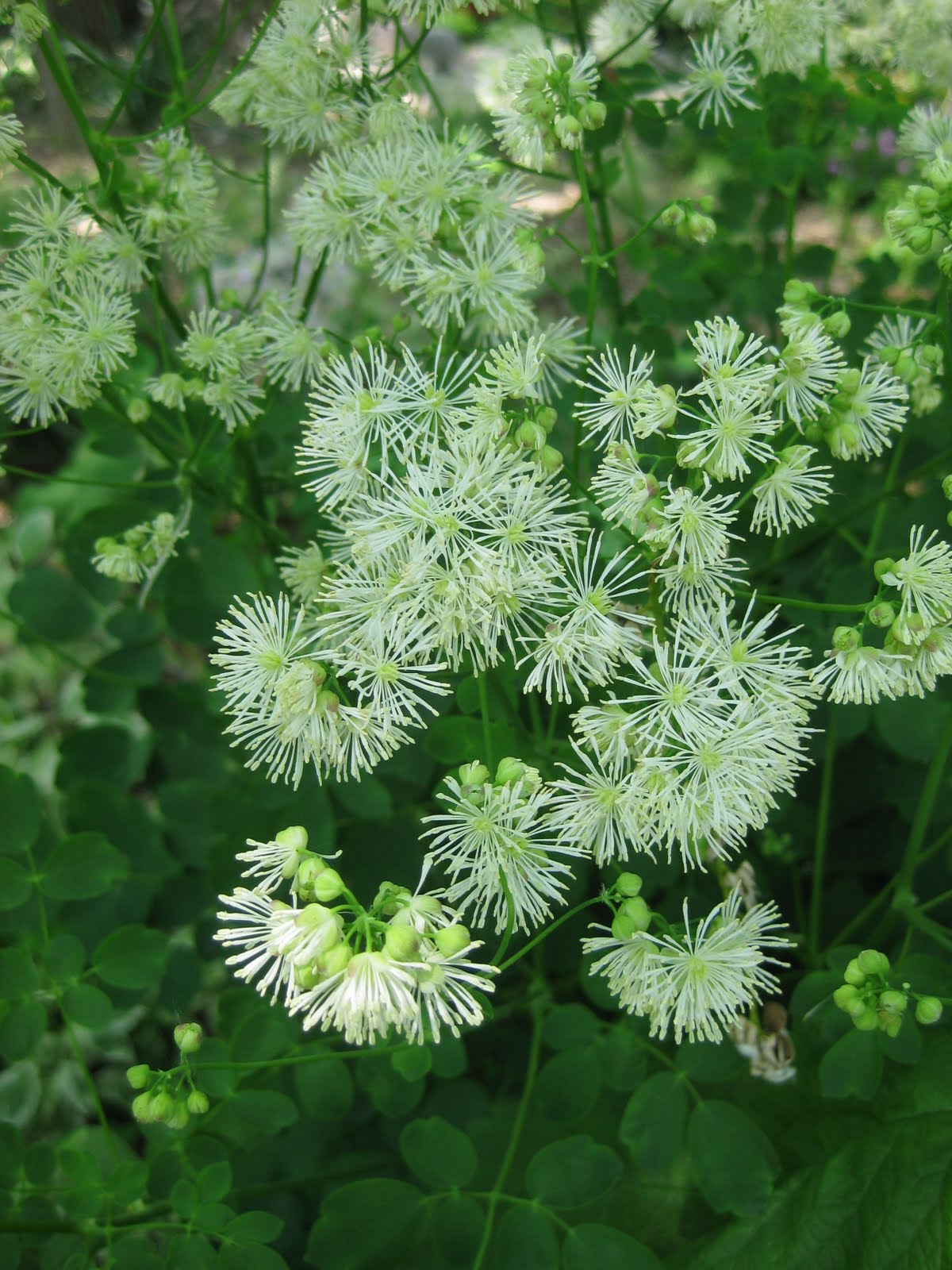 s very damp today after the quick deluge last night so we've been able to skip watering (despite the balmy afternoon temperatures). We've gotten off to a strong start with planting and will continue that momentum over the coming weeks. Nice shot to the left of goatsbeard (Aruncus dioicus) in the sunken garden that really does well with rich, damp soils in full sun. Goatsbeard isn't really a shade plant and moisture seems to be one of the most important factors for success. To the right is a meadowrue (Thalictrum aquilegifolium 'Album') that needs identical requirements. Meadowrues will take full sun with ample water although the specimen here is in our partly shaded woodland walk garden and has truly exquisite bloom clusters (40" tall plant). We had Kay here today and she worked on removing bulb foliage then shifted to planting annuals in the reception garden. I wish I had her here every day! Kelley and Sue came and planted a couple hundred annuals in their portion of the shade garden which will be quite colorful very soon. Jumbo Jim and John came to help Little Jerry in the Japanese garden and the guys hauled and placed more rocks near the new path. They also set some stepping stones. Dr. Yahr helped plant containers and did some planting in the reception garden as well. Dr. Gredler was here to mow and accomplish some turf repair and Bill did a nice job tidying up the paths after the pounding rains and resulting debris. He later moved on to bulb foliage removal. Below is a shot of Terry after smoothing a bed that Marv just rototilled and prepared. The guys are keeping ahead of our planting with their timely bed preparations.