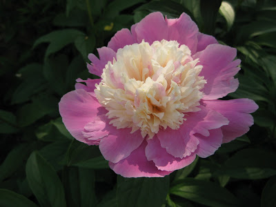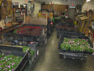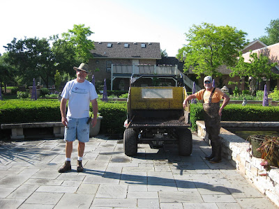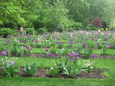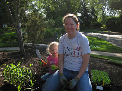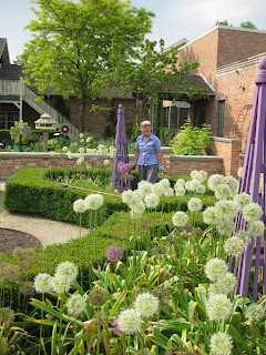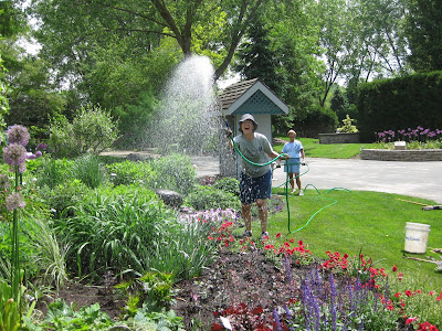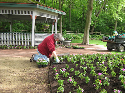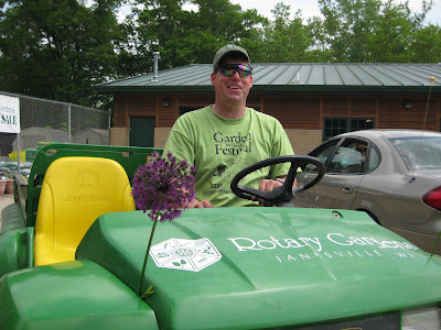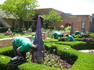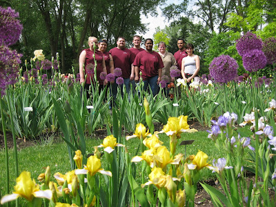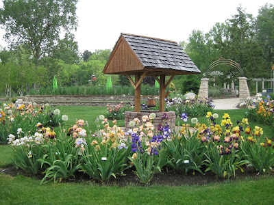 ked on some woodchipping then composted our large front slope bed that we'll plant in a week or two. It was a great system with Big John loading them up as they came back for more. Rollie worked on replacing damaged bricks while Vern, Bob A. and Jim continued to work on the new archway entrance in to the wishing well garden. The irises have peaked and still look amazing. There were many visitors out in the gardens including some tours. Marilyn, Mary and Glenna did an awesome job clearing out weeds and bulb foliage from an area that we will plant soon. Bill was here to do some clean-up this afternoon and we had Maggie planting and two volunteers planting with Janice. Mary and Roy were here to do more planting as well and put in a 1,000 annuals between the two of them. Hal and Doris started planting their space too. Cora and Janet planted some containers and Laura B. was a big help planting in various locations. I barely kept up with the various planters but it was a productive day to say the least. Nice shot to the right of the blue oat grass (Helictotrichon sempervirens 'Sapphire') in the Scottish garden. This is one of my favorites for a mid-size grasses. With all this heat, the peonies are going fast (nice shot below). I met Roger Anderson (from Fort Atkinson, WI) today touring the garden and he is an internationally known peony breeder and donated dozens of special peonies to the gardens over 18 years ago.Wednesday, May 26, 2010
