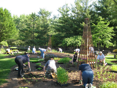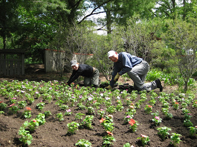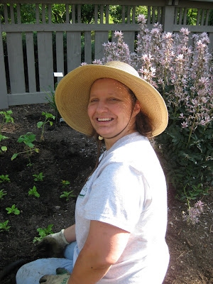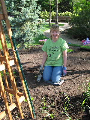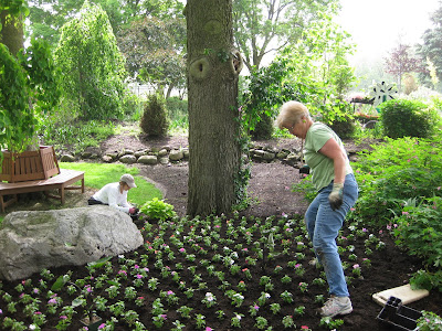 um and daffodil foliage from select areas in anticipation of upcoming planting this Thursday. It was brutal out there but they worked a solid 4 hours (see Kay to the left). Mary and Roy came in and planted their portion of the shade garden with annuals while Kelley