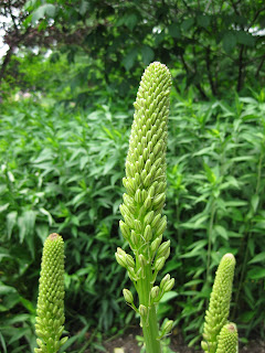 ! We had a wonderful day of volunteer contributions out in the gardens. Above is a group from the Mercy Health System that came in this afternoon to volunteer. These 12 volunteers planted 3,000 annuals, cleared weeds and prepared beds for planting. They were a fun group and we appreciate their time. Nice shot to the left of the foxttail lily (Eremurus sp.) getting ready to bloom. The flower stalk caught my eye and I'll post the open flower stalk image in a week or so.The Grumpies did an amazing amount of work today with Ron W., Del, Ron B. and Bob C. spreading cocoa bean hull mulch around our rose beds and the guys later moved on to other tasks including composting and mulching. Gary, Pat, Charlie and some of the other guys wor